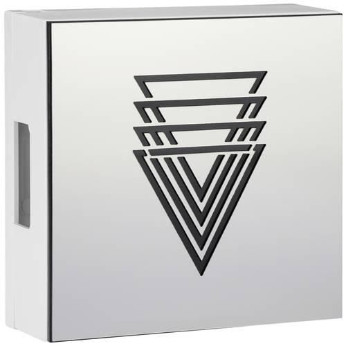 Gehäuse aus hochglänzendem weißem Kunststoff und mit einer Edelstahloptik aus Acryl-Front