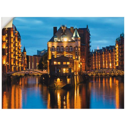 Das Wandbild mit dem Motiv "Teil der alten Speicherstadt in Hamburg nachts erleuchtet" des