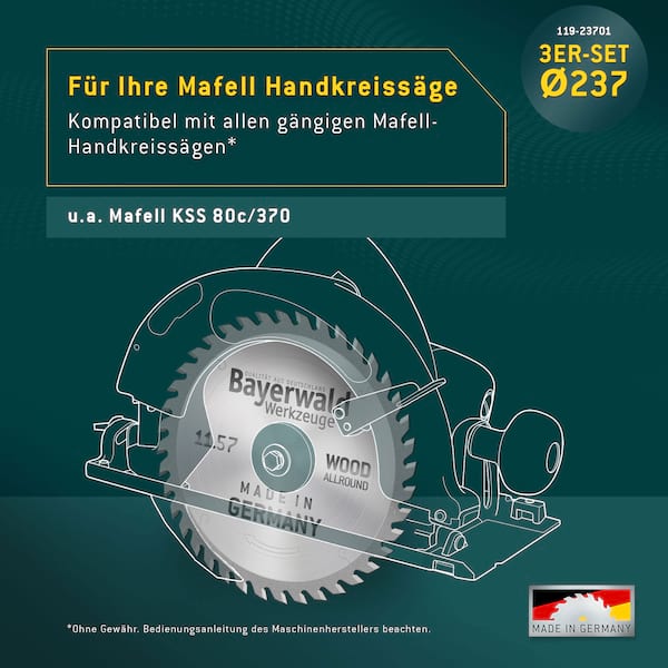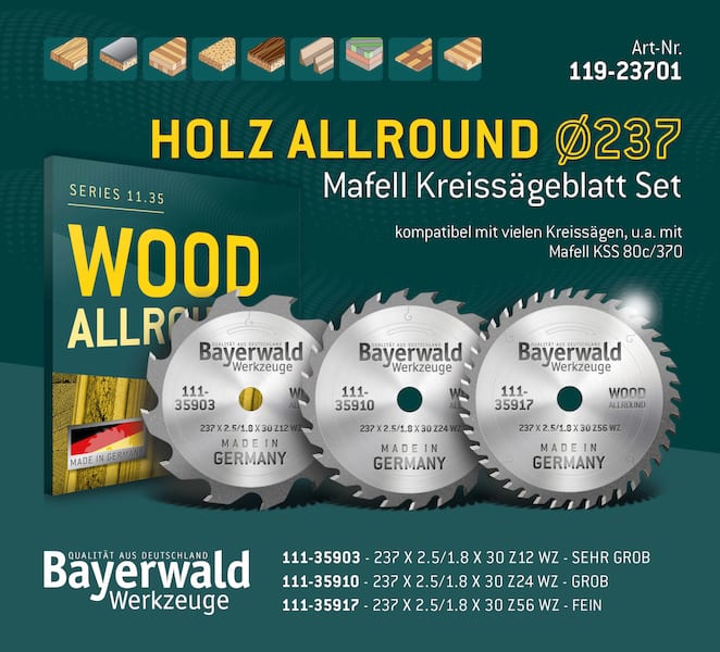 " Optimal geeignet für Maschinen des Herstellers Mafell wie der Mafell KSS 80c 370: Das Bayerwald Holz Allround Ø 237 Set. Sie erhalten drei Kreissägeblätter für die unterschiedlichsten Einsatzbereiche in der Holzbearbeitung. "