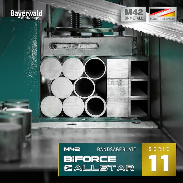 " Das Metall-Sägeband speziell entwickelt für den Einsatz bei schwierigen Bedingungen und Werkstücken wie z.B.: * Stark wechselnde Eingriffslängen * Unterbrochener Sägeschnitt * Mischung von Werkstücken Mit dem Bayerwald BiFORCE ALLSTAR erhalten Sie ein Allround-Sägeband ideal für kleinere und mittlere Werkstückabmessungen. Mit diesem lassen sich Stahlträger Rohre und Profile problemlos sägen. Zahnausbrüche werden durch die speziell entwickelte Struktur des Sägebandes zuverlässig vermieden - das Blatt läuft sehr vibrationsarm. Jedes Bayerwald Bandsägeblatt wird aus hochlegiertem Federbandstahl gefertigt und verfügt über Zahnspitzen aus legiertem Schnellarbeitsstahl. Dies sorgt für eine hohe Standzeit und minimiert so die Kosten und den Zeitaufwand für die Neubestückung der Bandsäge. Download: Bimetall-Sägebänder | Zahnteilungsempfehlungen () * Vorteile: * Allround-Sägeband für vielfältige Einsatzzwecke * Resistent gegen Zahnausbrüche auch bei schwierigen