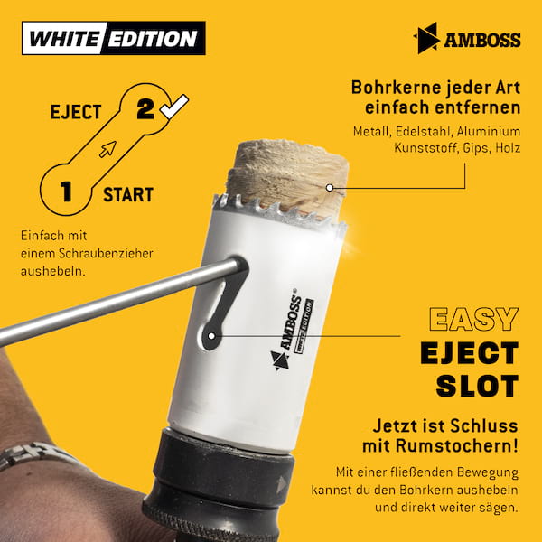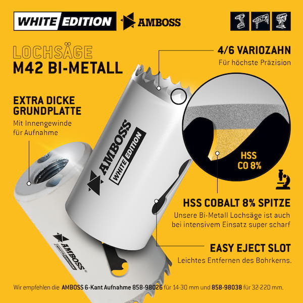 " Der Profi für Stahl und Edelstahl: Diese Lochsäge bietet dank ihrer Kobaltlegierung eine sehr lange Standzeit sowie hohe Präzision bei unterschiedlichen Bohrgeschwindigkeiten High-Tech in Ihrer Bohrmaschine: Die Amboss M42 Profi Lochsäge ist perfekt für den intensiven Einsatz geeignet. Vor allem Handwerker wie Elektriker Heizungsbauer bzw. Sanitärinstallateure und Schlosser schätzen ihre Vielseitigkeit und Qualität. Ihre Kobaltlegierung sorgt für eine lange Standzeit. Die Zahnteilung der M42 Lochsäge ist variabel (4-6 ZpZ) ein Verhaken wird so vermieden. Außerdem kann die Säge bei hohen sowie niedrigen Bohrgeschwindigkeiten eingesetzt werden.    Genau dann wenn es auf Präzision und saubere Schnittkanten ankommt schlägt die Stunde der Amboss M42 Profi Lochsäge. Mit ihr kann  von Stahl über Bunt- und Leichtmetalle bis hin zu Gipskarton oder Holz mit Nägeln eine große Zahl an Werkstoffen bearbeitet werden.    Hinweis: Für die Lochsäge ohne Adapter ist