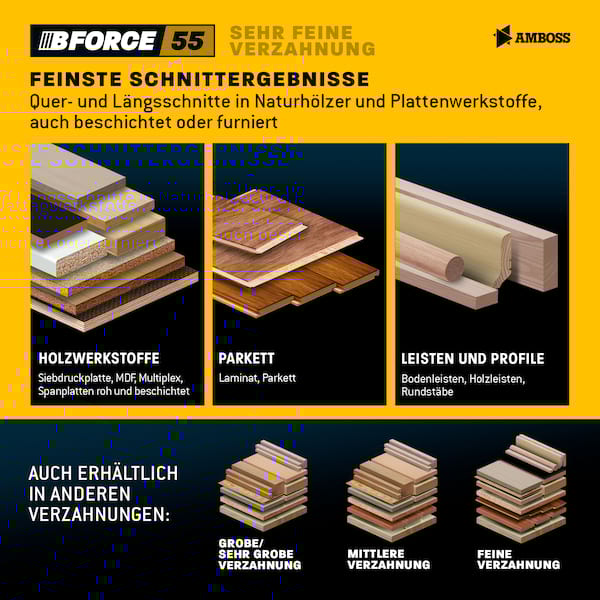 grobe Verzahnung eignet sich für Zu- und Längsschnitte in Weich- und Hartholz die mittlere