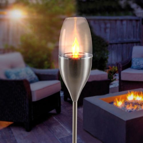 Edelstahl erheben sich die bernsteinfarbenen LED-Flammen der Solarfackel umgeben vom
