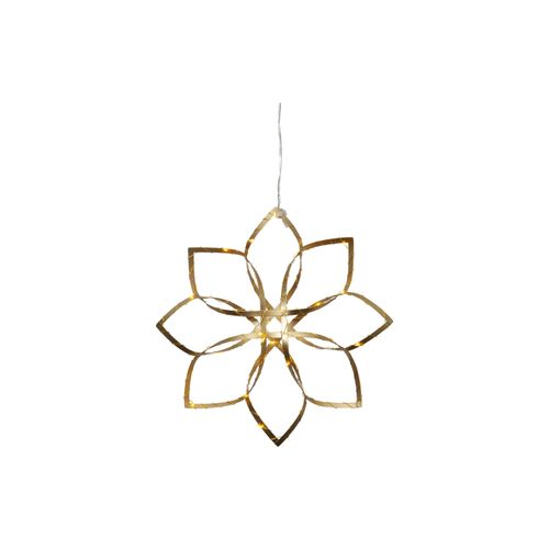 Star Trading Hänger Dekoration. Abmessungen: 30 x 30 x 4 cm (BxHxT). Für Innenbereich geeignet. Lebensdauer: 3000 h. Stern in messingfarbenem Metallband. Transformator: 3 V DC 0.9W IP20 Schuko Stecker. 36 LED-Lichter mit warmweissem Licht.