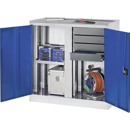 Werkzeug- und Beistellschrank 4 Schubladen 1 Fachboden 1 Mitteltrennwand Türen enzianblau.